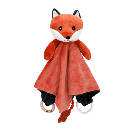 Adorable peluche renard avec couverture de 14'' par 14'' incluant anneaux et anneaux de dentition aux pointes de la couverture.